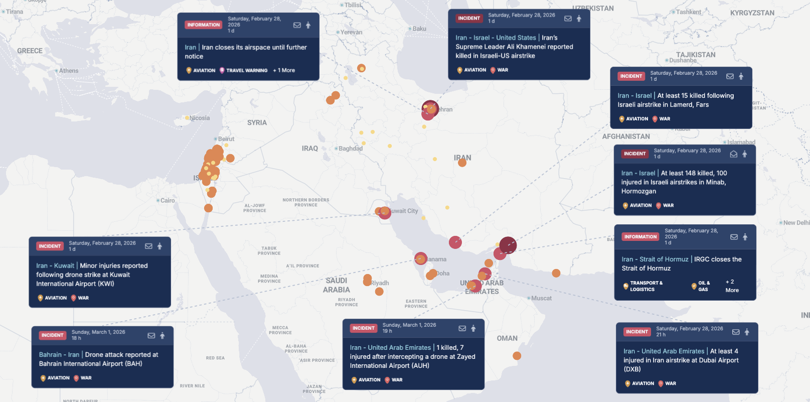 Operational risk then extended to airports as targets or collateral-damage sites—DXB, AUH, and BAH all had reported strike/debris incidents—raising the likelihood of temporary ground stops, delayed recovery waves, and airline network knock-on effects even where airspace remains nominally open.