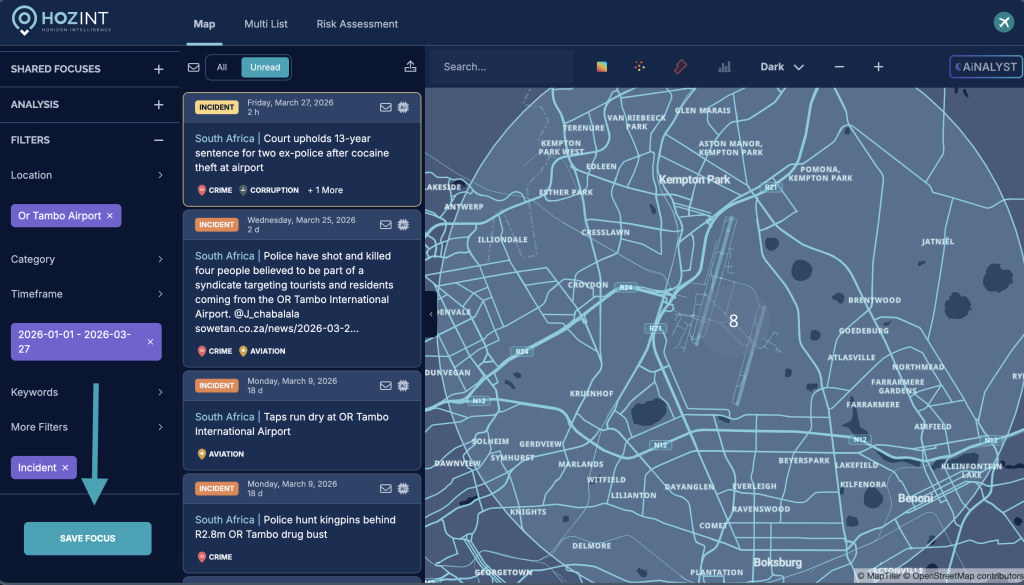 AI Analyst enables you to generate on-demand airport security risk assessments in seconds by analysing all relevant incidents within a defined area and timeframe. By combining geospatial filtering with structured intelligence analysis, you can quickly turn raw situational data into actionable insights.